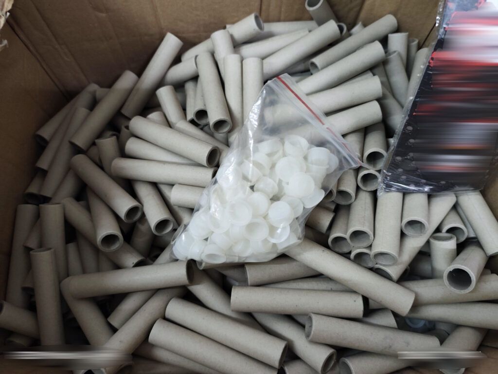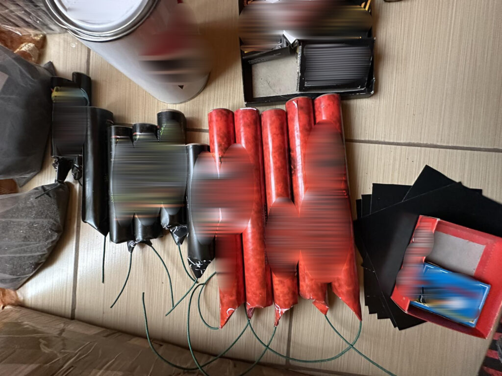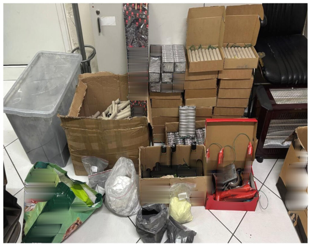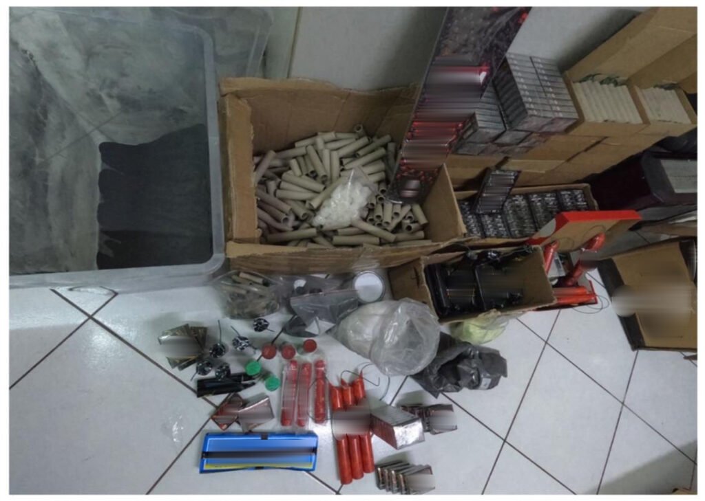 Κατά τη διάρκεια των ερευνών στην οικία και σε μια παρακείμενη αποθήκη, κατασχέθηκε ένας πραγματικός στρατιωτικός εξοπλισμός. Συγκεκριμένα, βρέθηκαν 5.842 κροτίδες, περισσότερα από 5,5 κιλά πυρίτιδας, 3 κιλά νιτρικού καλίου, καθώς και σημαντικές ποσότητες από σκόνη τιτανίου, αλουμινίου και θείου.