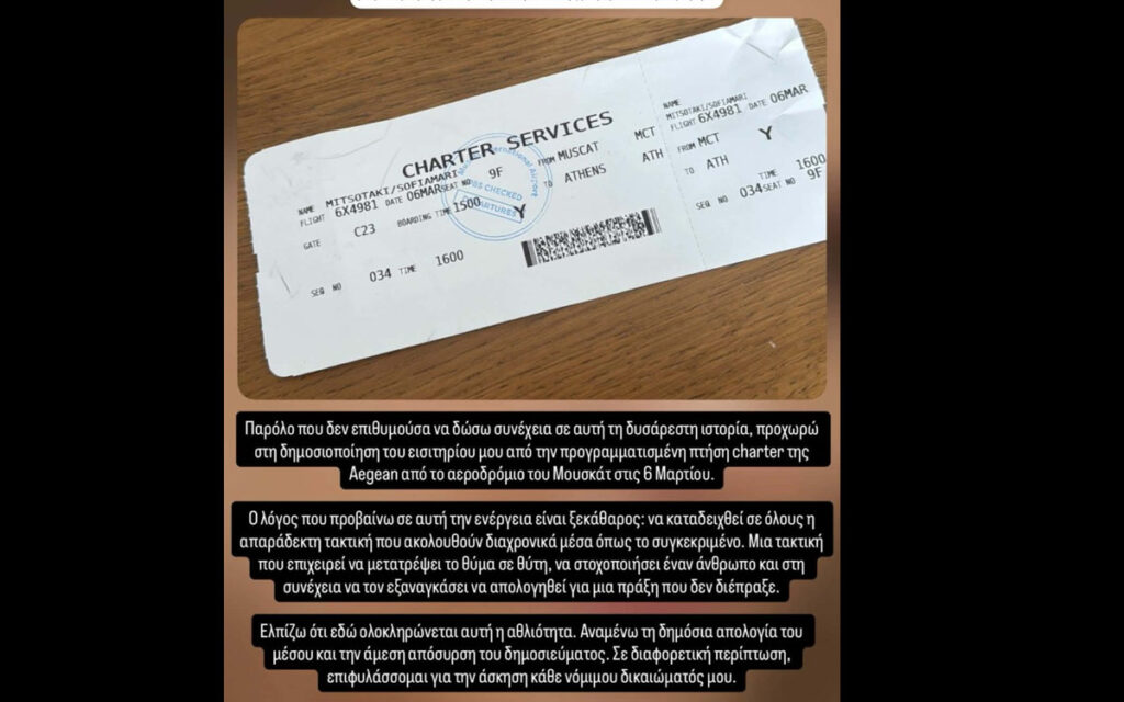 «Παρόλο που δεν επιθυμούσα να δώσω συνέχεια σε αυτή τη δυσάρεστη ιστορία, προχωρώ στη δημοσιοποίηση του εισιτηρίου μου από την προγραμματισμένη πτήση charter της Aegean από το αεροδρόμιο του Μουσκάτ στις 6 Μαρτίου.