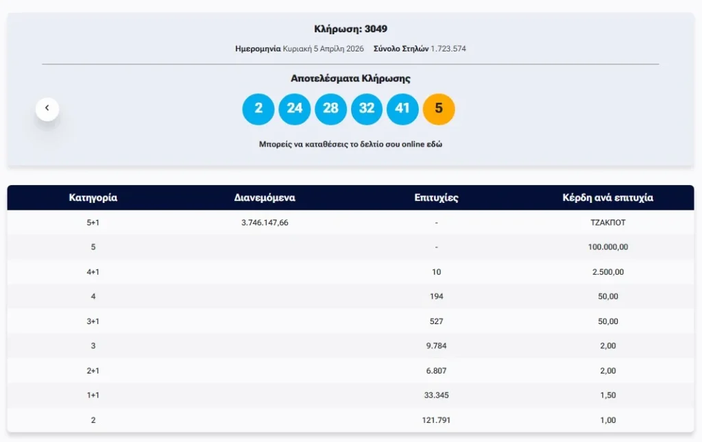 Έγινε το βράδυ της Κυριακής (5/4) η κλήρωση με αριθμό 3049 του ΤΖΟΚΕΡ.
