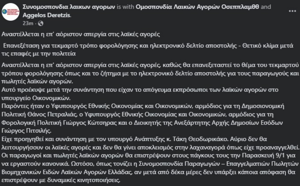 Οι δύο πλευρές κατέληξαν σε συμφωνία για την επανεξέταση αυτών των ζητημάτων, με στόχο οι ρυθμίσεις να προσαρμοστούν στα ρεαλιστικά δεδομένα και τις ιδιαιτερότητες που διέπουν τη λειτουργία των υπαίθριων αγορών.