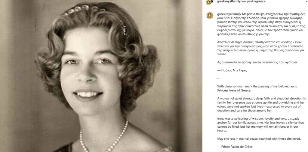 Ο Παύλος, γιος του τέως βασιλιά Κωνσταντίνου, θέλησε να τιμήσει τη μνήμη της θείας του δημοσίως, επιλέγοντας να μοιραστεί τα συναισθήματά του μέσω μιας συγκινητικής ανάρτησης στον προσωπικό του λογαριασμό στο Instagram. Στο μήνυμά του, συνόδευσε τη φωτογραφία της εκλιπούσας με λόγια βαθιάς εκτίμησης, χαρακτηρίζοντάς την ως μια γυναίκα «ήρεμης δύναμης» και απόλυτης αφοσίωσης στην οικογένεια.