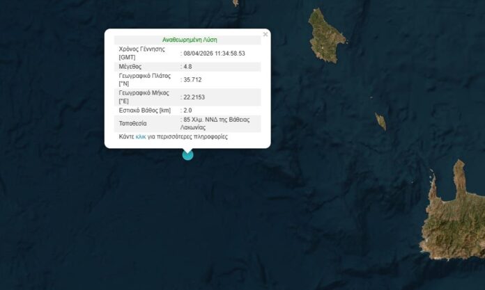 Σεισμική δόνηση μεγέθους 4,8 βαθμών της κλίμακας Ρίχτερ σημειώθηκε το μεσημέρι της Τετάρτης στον θαλάσσιο χώρο που εκτείνεται μεταξύ της Λακωνίας και της Κρήτης. Σύμφωνα με τα επίσημα στοιχεία από το Γεωδυναμικό Ινστιτούτο, η δόνηση καταγράφηκε λίγο μετά τις 14:30.