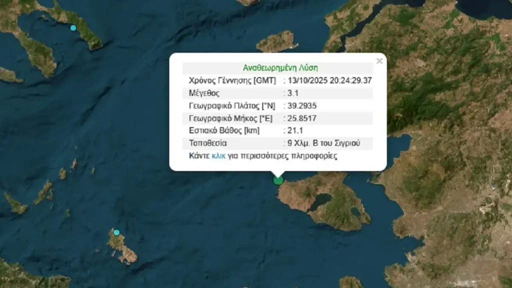 Σεισμός 3,1 Ρίχτερ σημειώθηκε το βράδυ της Δευτέρας 13 Οκτωβρίου στη Λέσβο στη θαλάσσια περιοχή ανοικτά του Σιγριού.