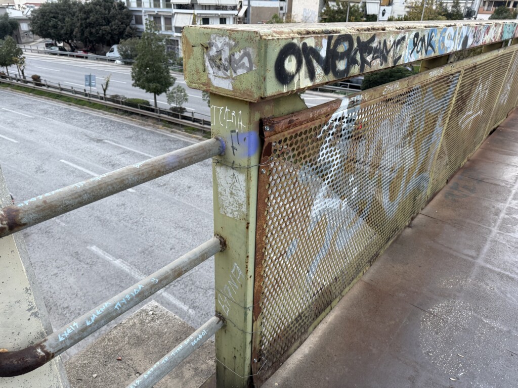 Κάθε πρωί, εκατοντάδες πολίτες διασχίζουν την πεζογέφυρα στη συμβολή της Λεωφόρου Παναγή Τσαλδάρη (Χαμοστέρνας) με την οδό Καλλιρρόης, στα σύνορα Καλλιθέας και Κουκακίου. Κάτω από τα πόδια τους, τα αυτοκίνητα τρέχουν με ταχύτητα. Δίπλα στα χέρια τους, όμως, η εικόνα είναι αποκαρδιωτική: μέταλλα που έχουν παραδοθεί στη σκουριά, μπετόν που έχει αρχίσει να «σκάει» και προστατευτικά πλέγματα μπαλωμένα πρόχειρα με σύρμα.