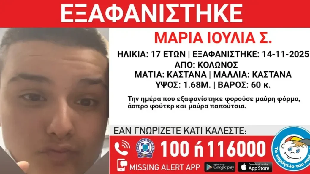 Συναγερμός έχει σημάνει στο «Χαμόγελο του παιδιού», για την εξαφάνιση της17χρονης Μαρίας Ιουλίας, από χώρο φιλοξενίας στο κέντρο της Αθήνας στις 14/11.